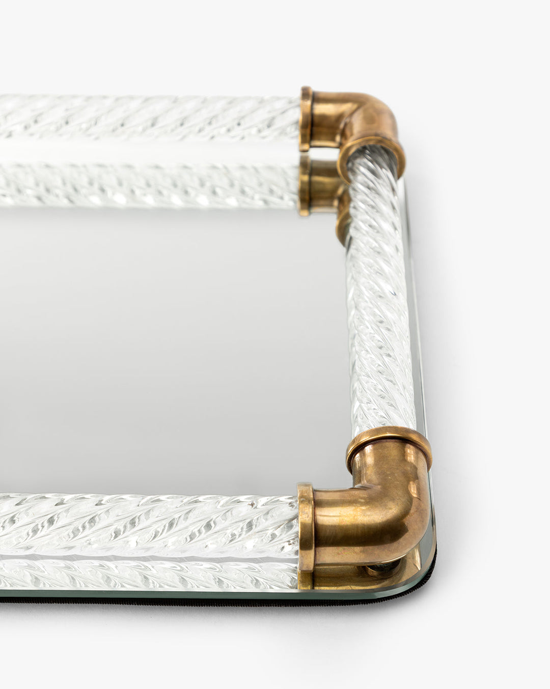 Showcasing a striking blend of glass and brass, our Rhodes Tray offers sculptural detail and a refined presence. The twisted glass edges and warm brass corners add a touch of classic sophistication, making it a versatile accent for styling.