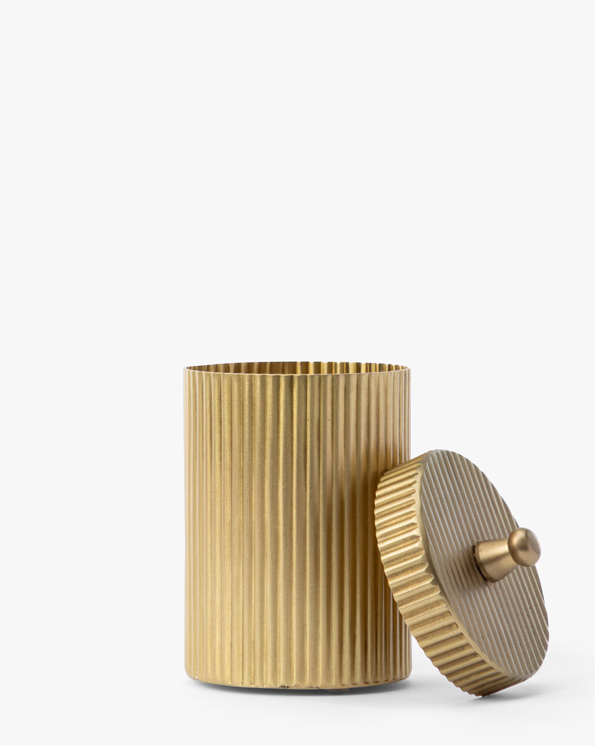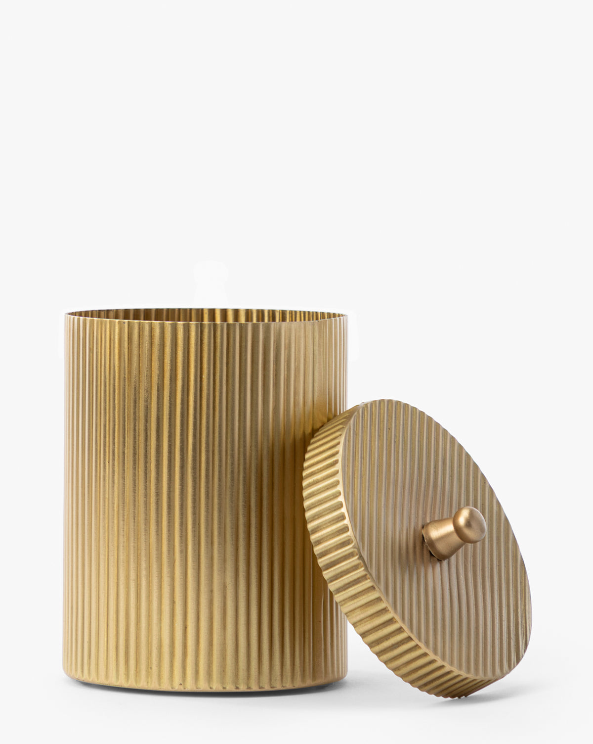 With its fluted texture and warm brass finish, the Calvert Canister brings both utility and refinement to everyday storage. Topped with a simple knobbed lid, it’s perfect for corralling small essentials in the kitchen, bathroom, or office while adding a touch of understated elegance.